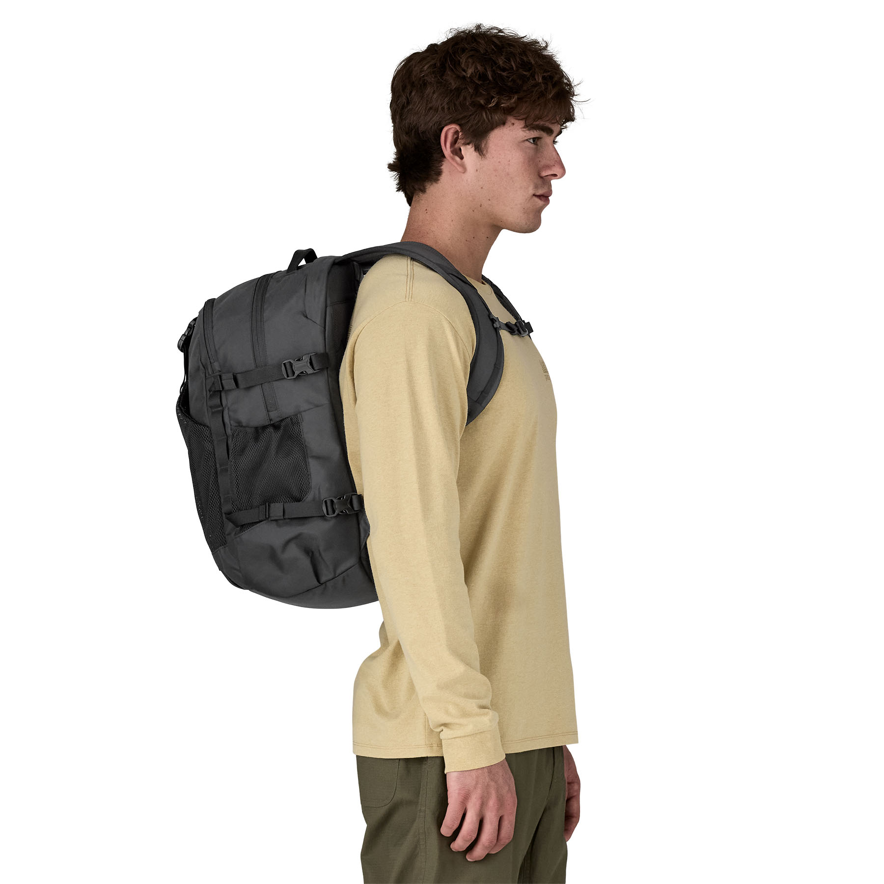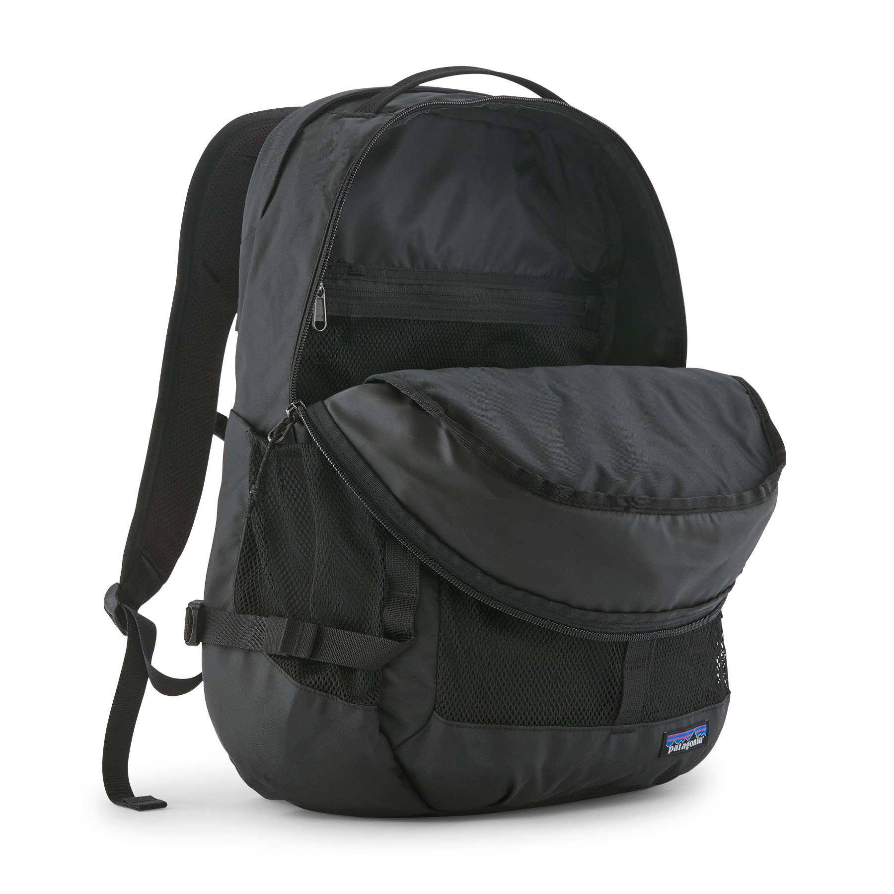 Constructed entirely from recycled materials, the backpack includes a durable water repellent (DWR) finish made without intentionally added PFAS, supporting Patagonia’s sustainability standards.